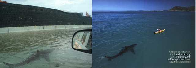 Salah satu contoh konten yang dimanipulasi dan terus menerus beredar di internet adalah foto seekor hiu yang sedang berenang di jalan raya yang dilanda banjir di bawah ini. Foto ini mulai beredar sejak tahun 2011 ketika badai Irene menerjang Puerto Rico dengan peringatan agar orang-orang tidak berenang di air yang menggenang setelah badai. Foto yang sama terus diedarkan dengan keterangan yang berubah-ubah lokasinya. Si hiu dikatakan ada di Houston, USA setelah hujan deras pada tahun 2015, di Florida setelah badai Matthew tahun 2016, dan kembali ke Houston setelah badai Harvey di tahun 2017. Banyak orang yang terkecoh, padahal foto hiu ini adalah hasil manipulasi dari foto asli seekor hiu yang sedang membuntuti kayak yang terbit di sebuah majalah.