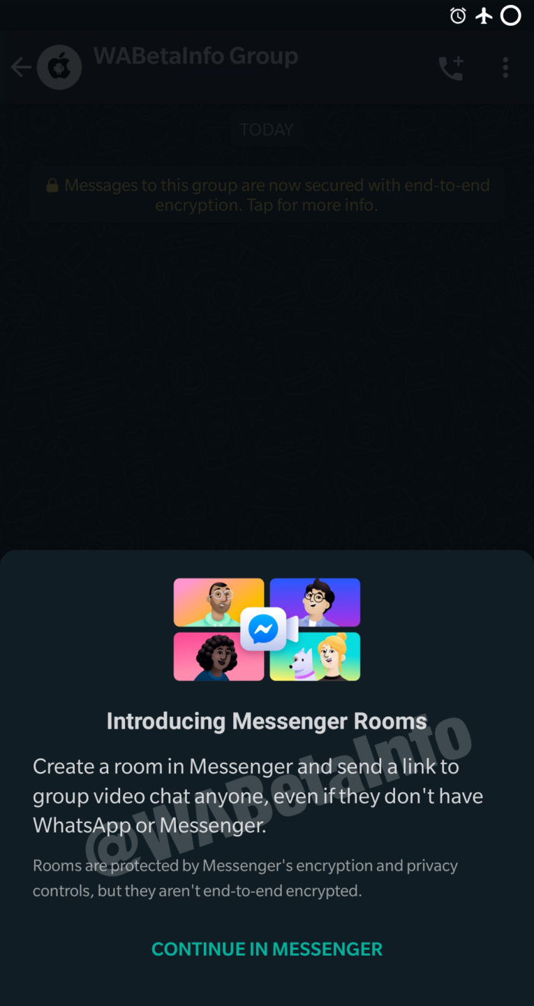 Messenger Room sebelumnya telah diluncurkan di Facebook, platform jejaring sosial yang kini berada di bawah bendera yang sama dengan Whatsapp. Pengguna Whatsapp kini bisa dengan mudah ‘create room’ di Messenger Room.