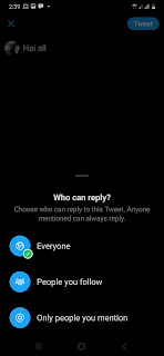 Fitur ini berguna untuk menentukan siapa yang bisa membalas Tweet yang Mama buat. Opsi yang tersedia ialah, semua orang bisa membalas, hanya orang yang diikuti, dan hanya orang yang disebutkan dalam twit saja.