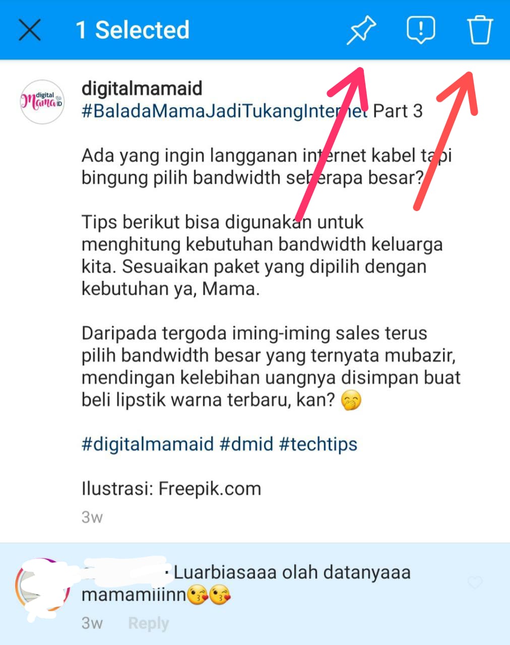 Jika ada komen yang membuat tidak nyaman, Mama bisa menghapusnya. Tekan komentar negatif tersebut, lalu ketik ikon tempat sampah yang muncul di kanan atas.