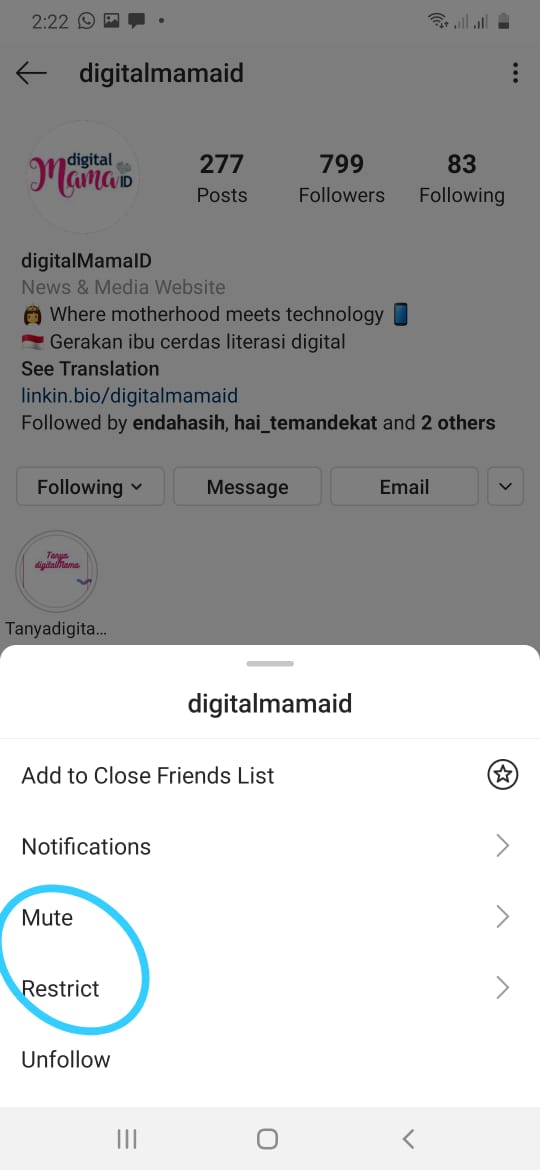 Jika Mama merasa terganggu dengan unggahan teman tapi segan untuk unfollow, ini bisa jadi solusi. Tenang saja, akun tersebut tidak akan mendapat notifikasi jika kita mengaktifkan fitur mute terhadapnya.