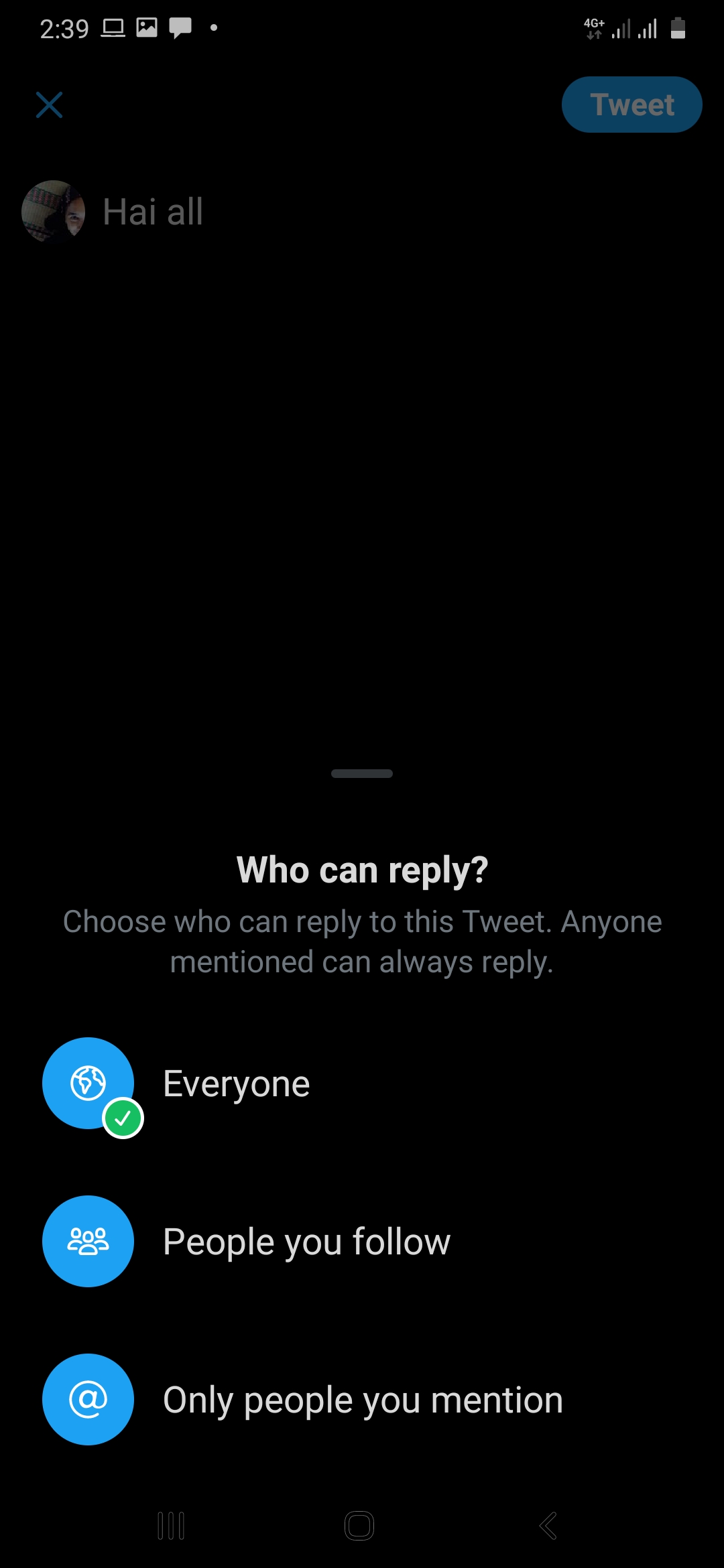 Fitur ini berguna untuk menentukan siapa yang bisa membalas Tweet yang Mama buat. Opsi yang tersedia ialah, semua orang bisa membalas, hanya orang yang diikuti, dan hanya orang yang disebutkan dalam twit saja.