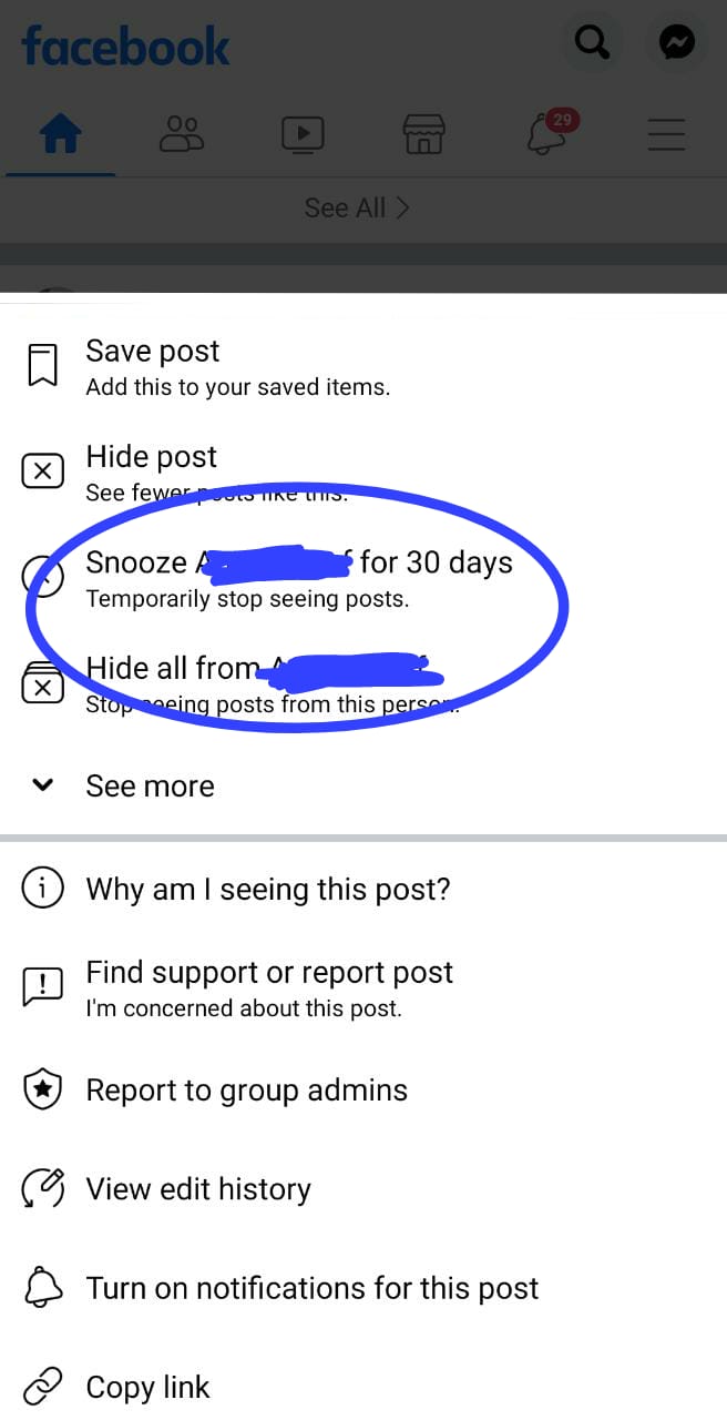 Caranya dengan mengetuk tiga titik di kanan atas pada Kabar Beranda (Bews Feed) Mama. Pilih Snooze (nama pengguna) selama 30 hari. Mama bisa mengurungkannya jika berubah pikiran.
