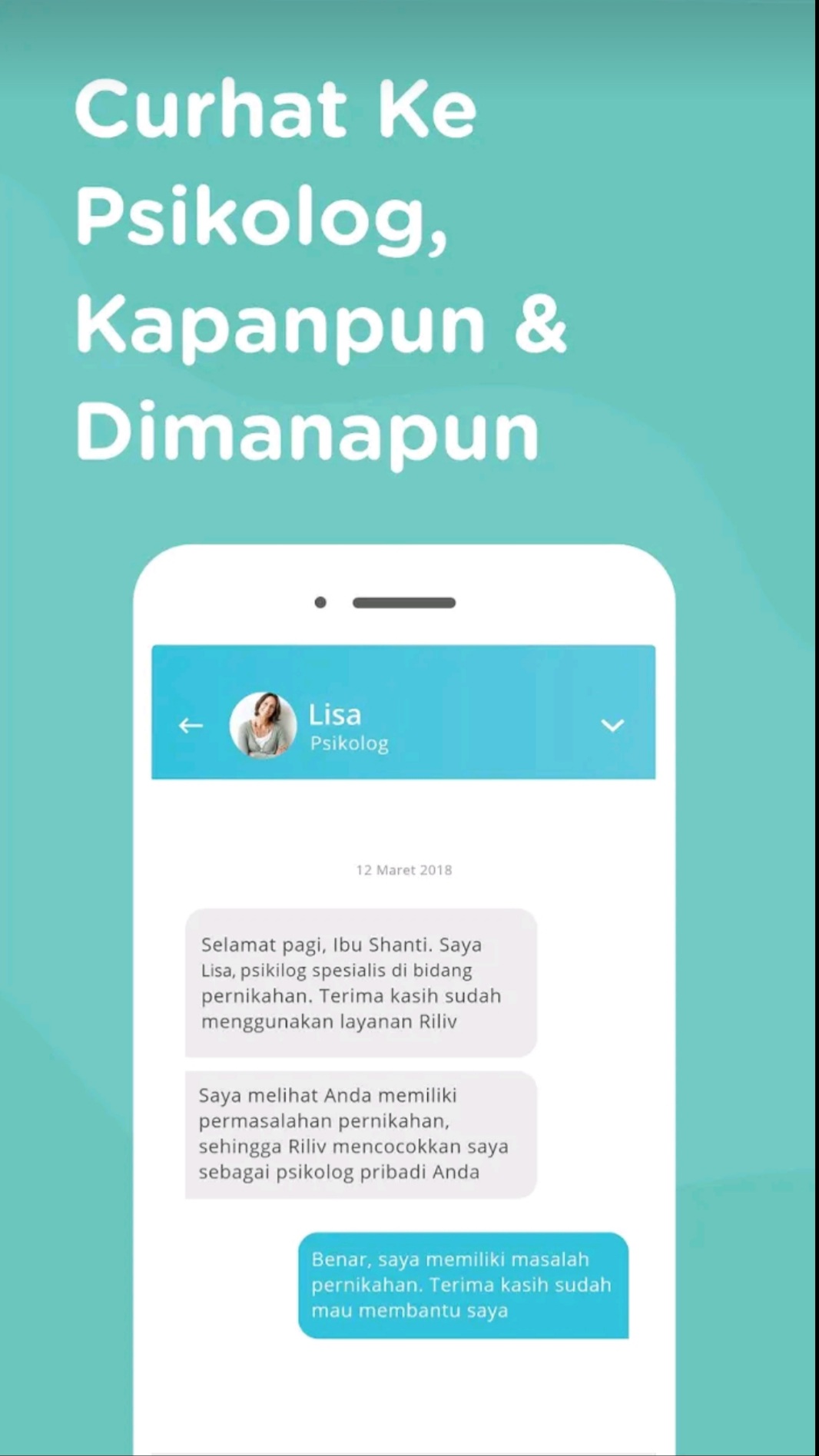 Riliv diklaim sebagai pelopor aplikasi kesehatan mental di Indonesia. Aplikasi buatan alumni Universitas Airlangga ini menyediakan layanan konseling terkait berbagai persoalan. Mama bisa menggunakan layanan curhatnya secara gratis. Namun, jika menginginkan saran medis Mama perlu menggunakan layanan premium yang berbayar. Tersedia pula layanan meditasi dan penanganan gangguan tidur.