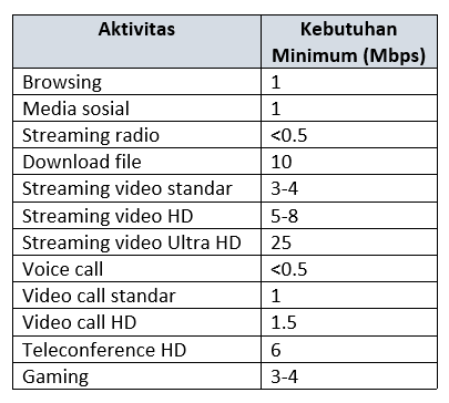 Untuk apa saja internet digunakan di setiap perangkat? Aktivitas yang berbeda membutuhkan bandwidth yang berbeda pula. Streaming, gaming, dan teleconference membutuhkan bandwidth yang cukup agar tidak terjadi buffering atau jeda (lag) yang mengganggu kelancaran koneksi. Berikut ini panduan kasar yang dapat Mama gunakan untuk mengira-ngira kebutuhan bandwidth. Jika koneksi internet yang kita miliki lebih dari kebutuhan minimal yang disarankan, akses akan lebih cepat berjalan.