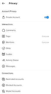 Untuk mengatur setelan privasi di Instagram, klik gambar profil di sudut kanan bawah, lalu klik tiga baris di kanan atas. Kemudian pilih pengaturan yang terletak di kanan bawah. Pilih privacy dengan ikon gembok.