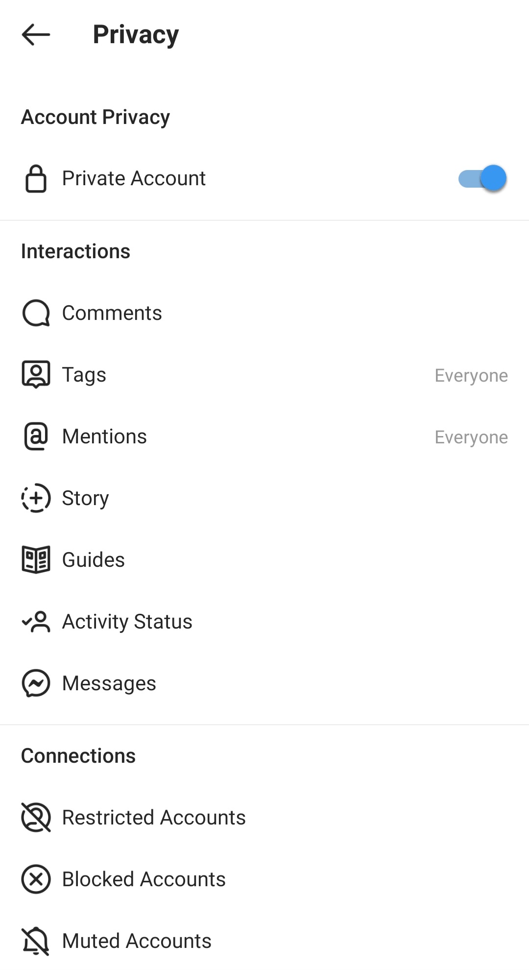 Untuk mengatur setelan privasi di Instagram, klik gambar profil di sudut kanan bawah, lalu klik tiga baris di kanan atas. Kemudian pilih pengaturan yang terletak di kanan bawah. Pilih privacy dengan ikon gembok.