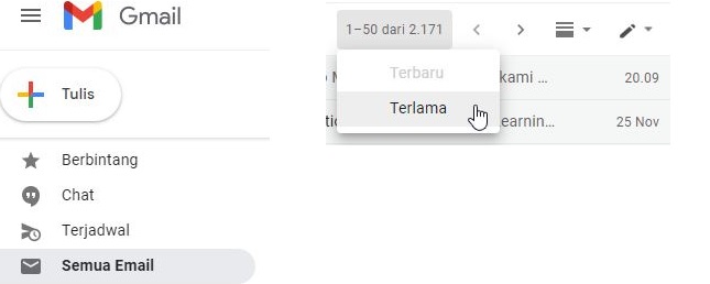 Agar kita bisa menghapus secara lebih menyeluruh, di Gmail kita dapat menampilkan semua email kemudian mengurutkannya berdasar tanggal. Mama bisa mulai bekerja dari email yang paling awal.