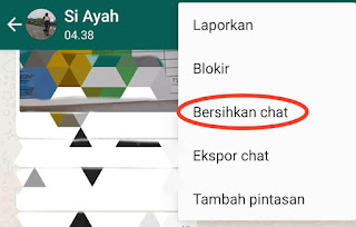 2. Masuk ke dalam chat kemudian pilih menu di ujung kanan atas, Lainnya > Bersihkan chat. Dengan cara ini isi chat akan dihapus tetapi chat masih akan ditampilkan di tab CHAT dalam keadaan kosong atau menyisakan pesan berbintang saja.