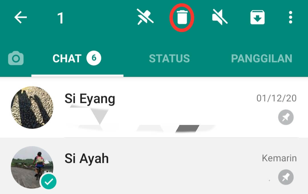 1. Ketuk dan tahan chat lalu ketuk ikon Hapus. Chat yang dihapus tidak akan tampil lagi di tab CHAT. Opsi ini berlaku untuk chat individual sedangkan chat grup masih akan terlihat di tab CHAT dan hanya akan terhapus jika kita keluar dari grup.