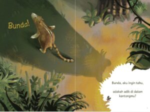 Selain belajar mengenal hubungan kekeluargaan, Mantel Emas juga memberikan pengetahuan pada anak mengenai tanaman dan satwa liar endemik yang hanya ada di Indonesia. Seperti ekidna, burung cenderawasih, kupu-kupu raksasa hingga buah matoa. Buku ini bisa juga direkomendasikan untuk mama dan kakak yang sedang menunggu kelahiran adik. Sila berselancar ke sini untuk membacanya, Mama!