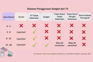 Dikutip dari Cris Rowan dari American Academy Pediatrics ada batasan penggunaan gadget dan TV berdasarkan kelompok usia sebagai berikut: