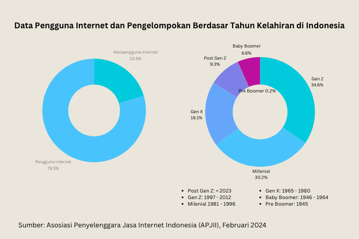Menurut Asosiasi Penyelenggara Jasa Internet Indonesia (APJII), 79,5% penduduk Indonesia telah menggunakan internet. Meskipun pengguna paling besar berasal dari generasi Z, namun pengguna berusia lanjut tidak sedikit. Jika digabungkan, pengguna dari generasi X, baby boomer, dan pre-boomer mencapai lebih dari 25%.
