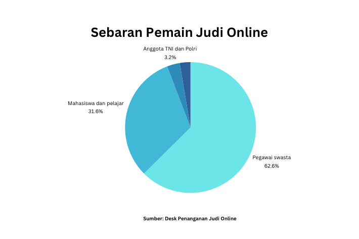 Berdasarkan data Desk Penanganan Judi Online, pemain judol berasal dari berbagai kalangan. Data yang ada menunjukkan, 1,9 juta orang merupakan pegawai swasta, 960 ribu orang dari kalangan mahasiswa dan pelajar, 96 ribu orang merupakan aparat TNI/Polri, serta 80 ribu korban anak-anak. Persoalan kompleks yang melibatkan banyak kalangan dengan latar belakang pendidikan, pendapatan dan profesi yang berbeda ini tentu pemantiknya tidak tunggal, tidak sama satu dengan yang lainnya.