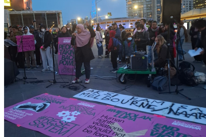 “Hentikan kekerasan polisi terhadap demonstran dan bebaskan seluruh demonstran yang ditahan secara sewenang-wenang oleh polisi sekarang juga,” kata koordinator aksi Melbourne Bergerak Pipin Jamson.