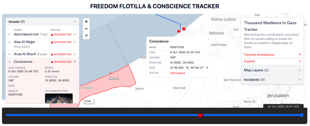 GSF bahkan membuat laman “Tracker” di situs resminya agar masyarakat bisa memantau posisi kapal secara langsung. Sayangnya, dari 45 kapal yang berlayar antara Juni hingga Oktober 2025, hampir semuanya dicegat oleh angkatan laut Israel, sekitar 40 mil laut dari pesisir Gaza.